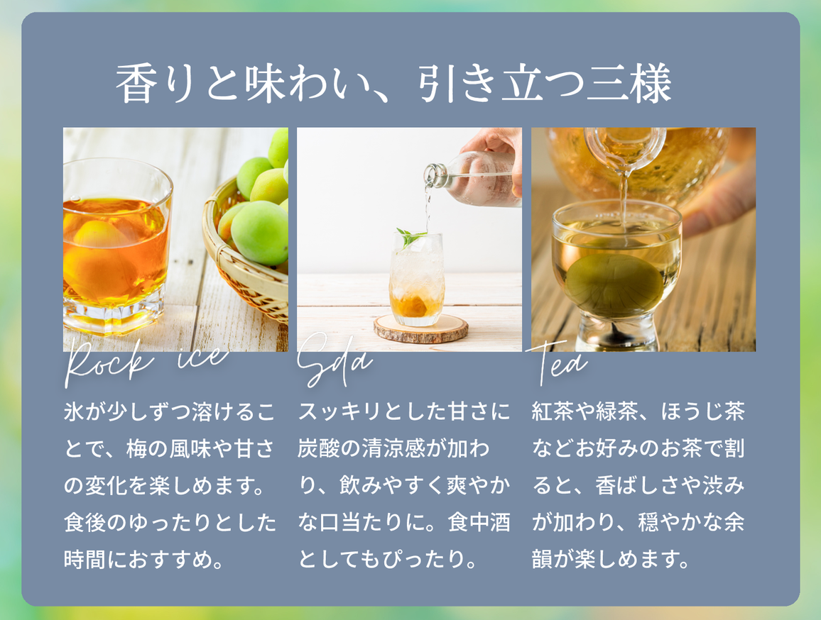 日本酒本来の旨味と、南高梅の芳醇な香りが溶け合い、まろやかでコクのある味わいに仕上がっています。